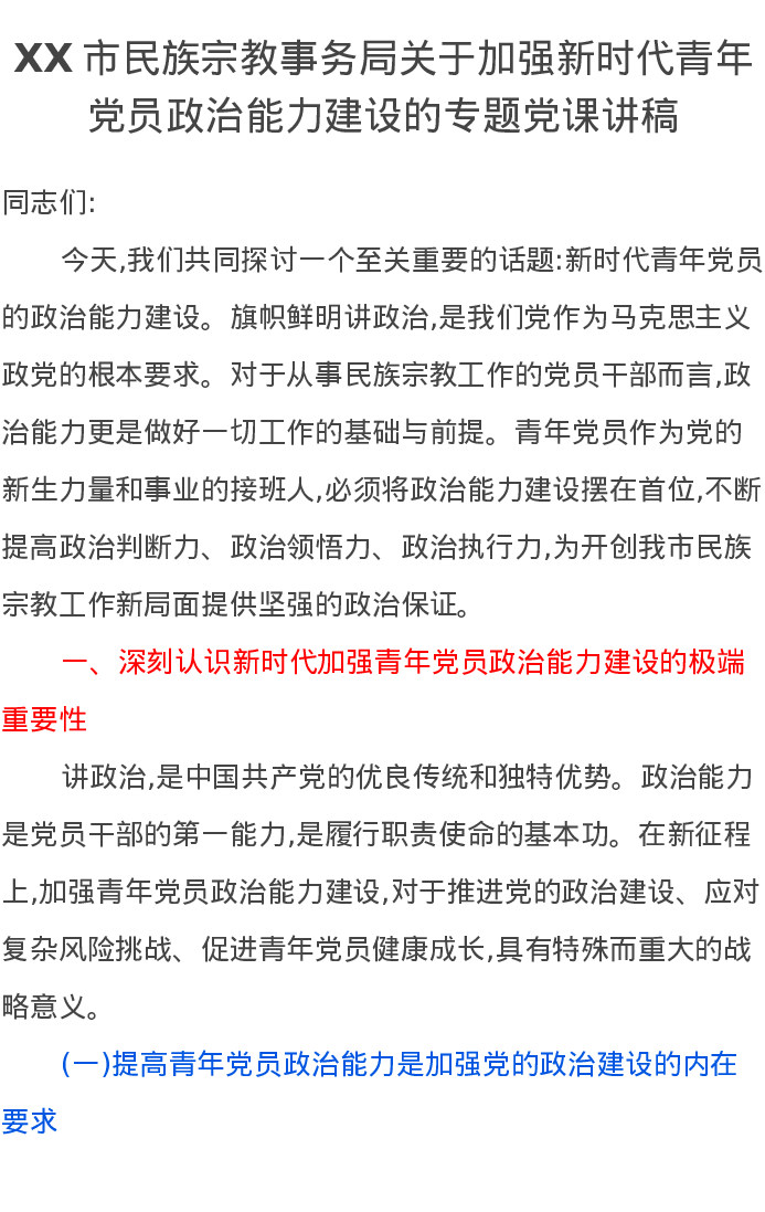 XX市民族宗教事务局关于加强新时代青年党员政治能力建设的专题党课讲稿