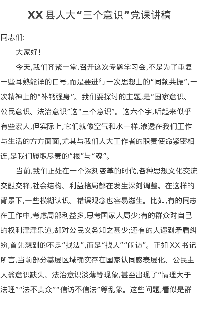 XX县人大“三个意识”党课讲稿