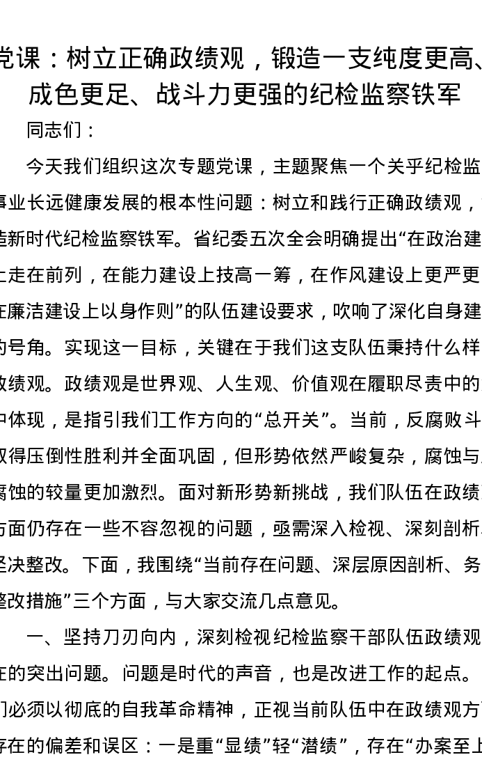 党课讲稿:树立正确政绩观,锻造一支纯度更高、成色更足、战斗力更强的纪检监察铁军