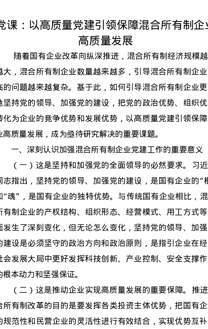 党课讲稿:以高质量党建引领保障混合所有制企业高质量发展