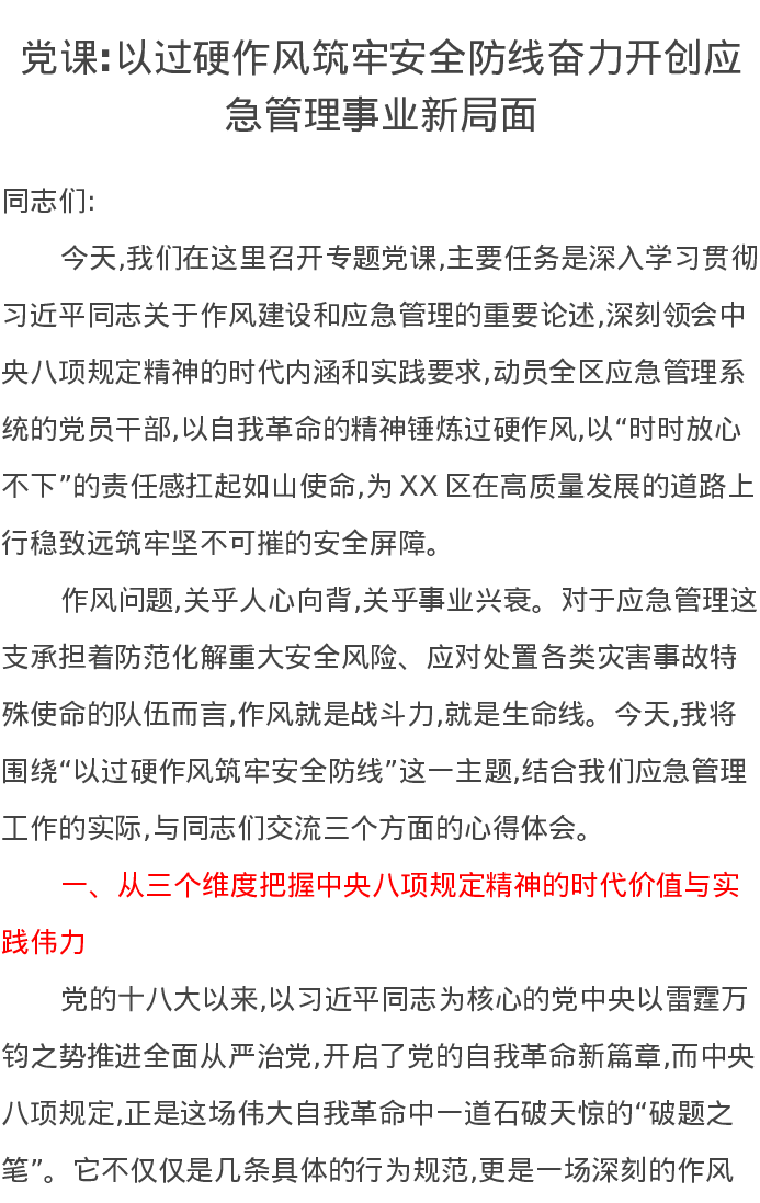 党课讲稿:以过硬作风筑牢安全防线奋力开创应急管理事业新局面