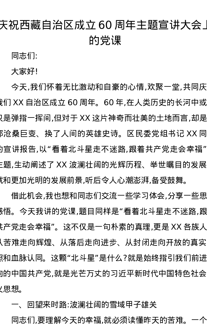 庆祝西藏自治区成立60周年主题宣讲大会上的党课讲稿