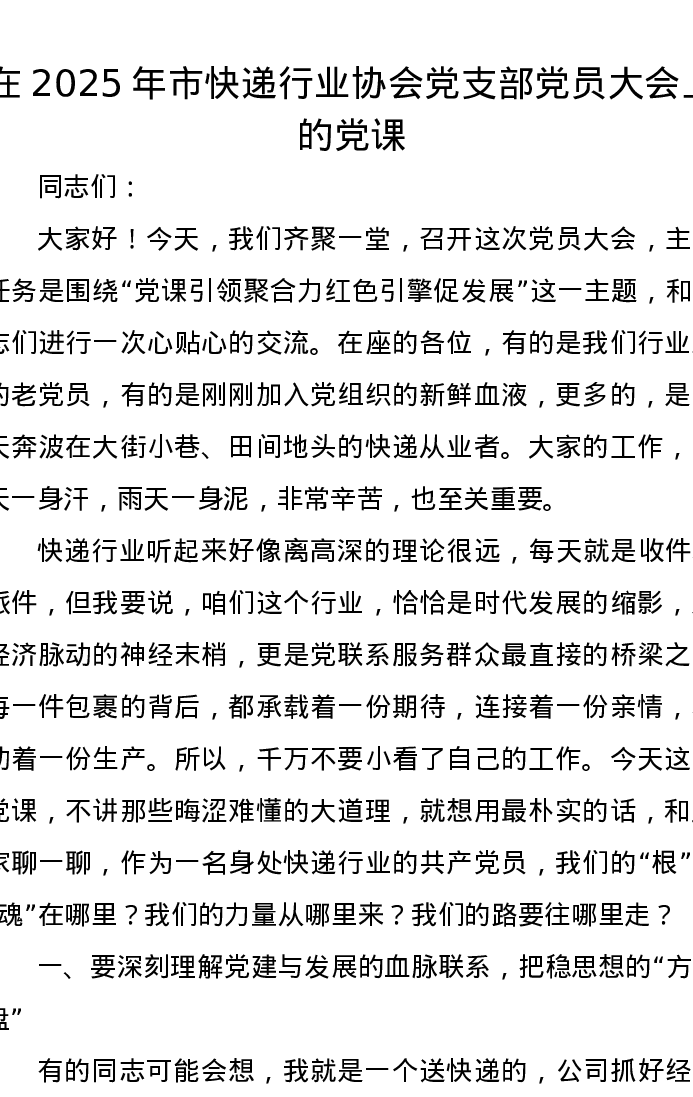 在2025年市快递行业协会党支部党员大会上的党课讲稿