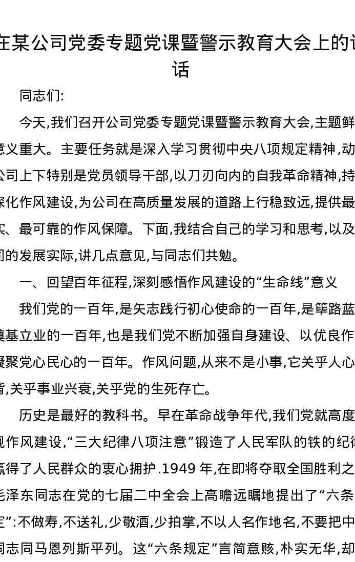 在某公司党委专题党课暨警示教育大会上的讲话