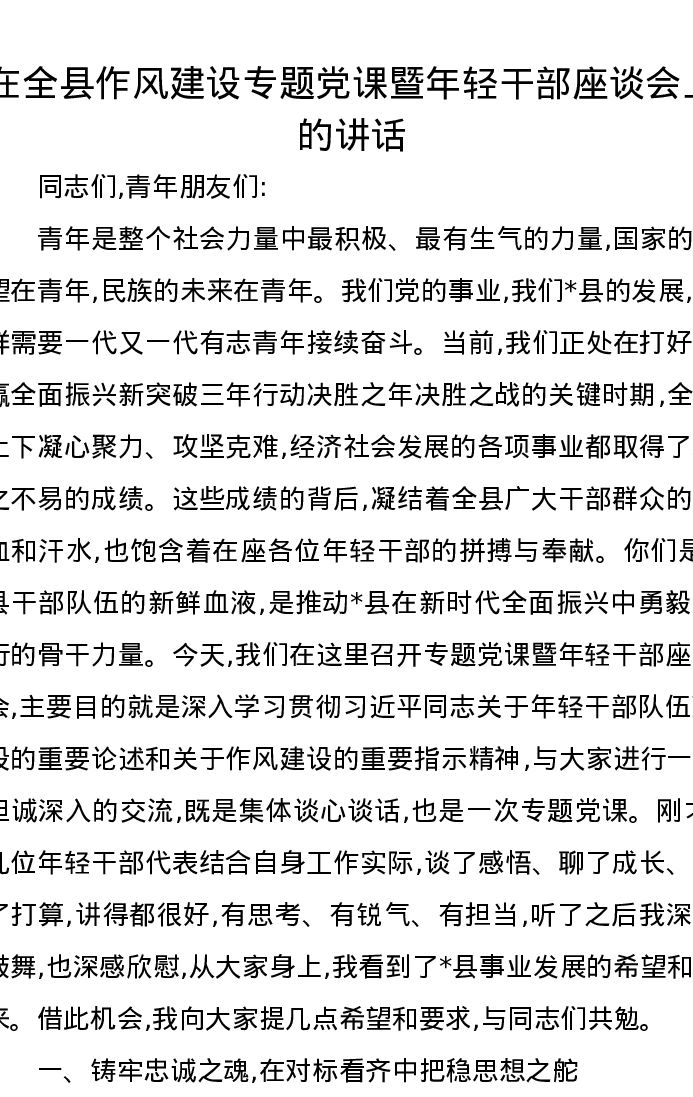 在全县作风建设专题党课暨年轻干部座谈会上的讲话