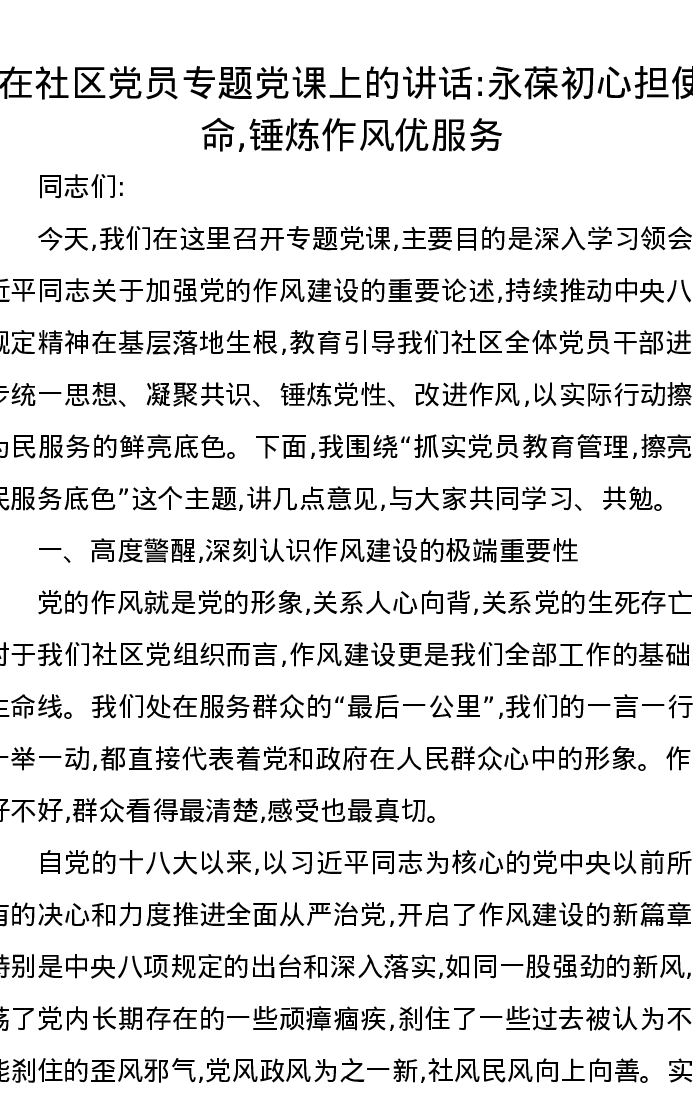 在社区党员专题党课上的讲话永葆初心担使命,锤炼作风优服务