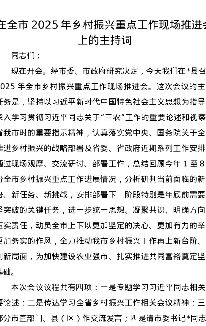 在全市2025年乡村振兴重点工作现场推进会上的主持词
