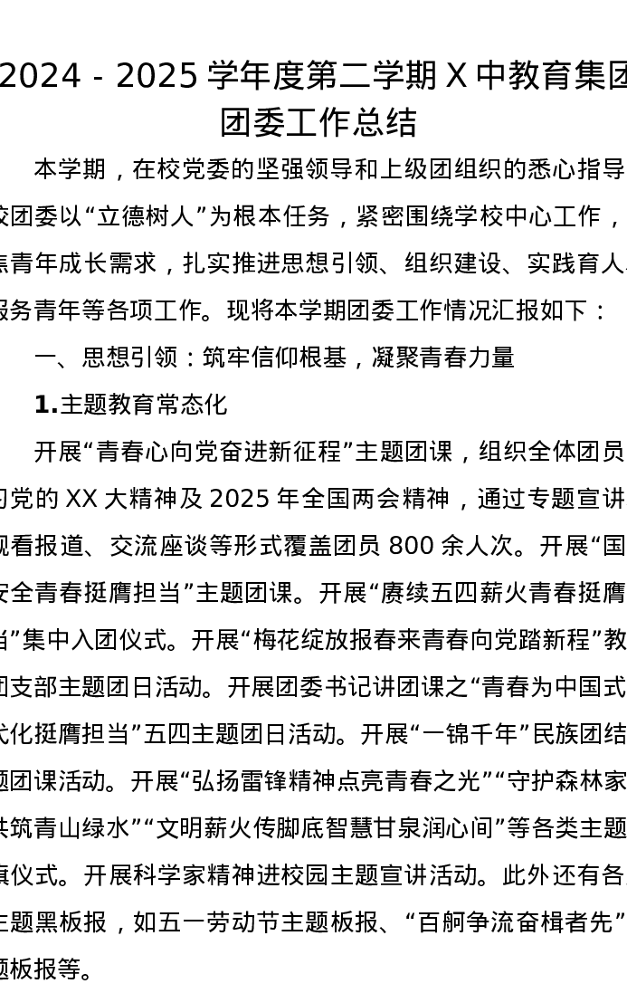 2024-2025学年度第二学期X中教育集团团委工作总结