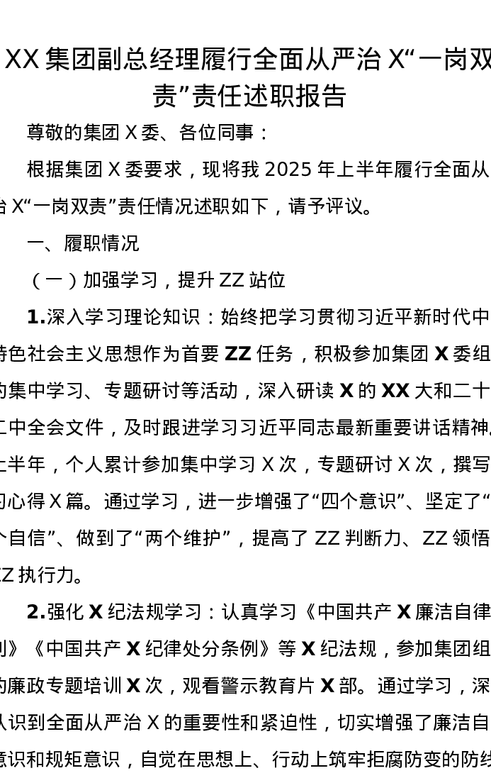 XX集团副总经理履行全面从严治党“一岗双责”责任述职报告