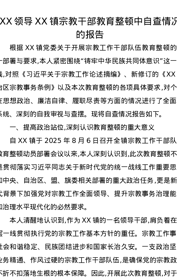 XX领导XX镇宗教干部教育整顿中自查情况的报告