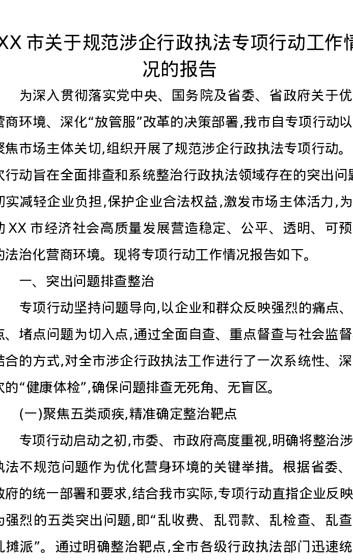 XX市关于规范涉企行政执法专项行动工作情况的报告
