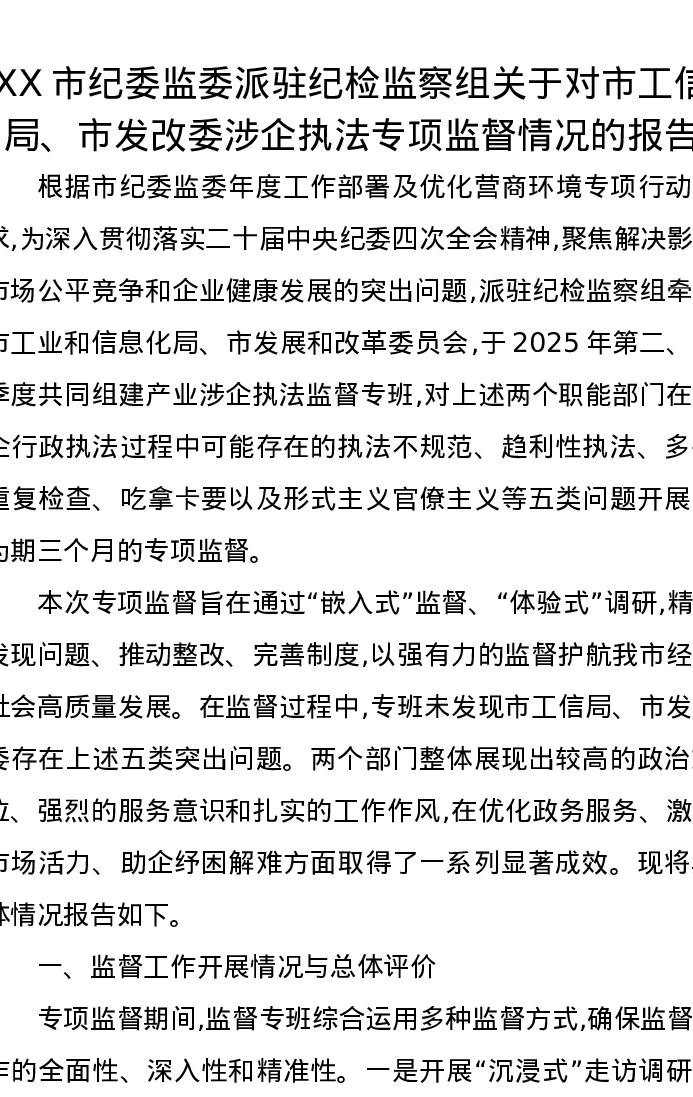 XX市纪委监委派驻纪检监察组关于对市工信局、市发改委涉企执法专项监督情况的报告