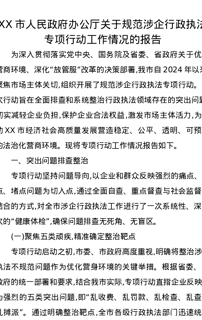 XX市人民政府办公厅关于规范涉企行政执法专项行动工作情况的报告