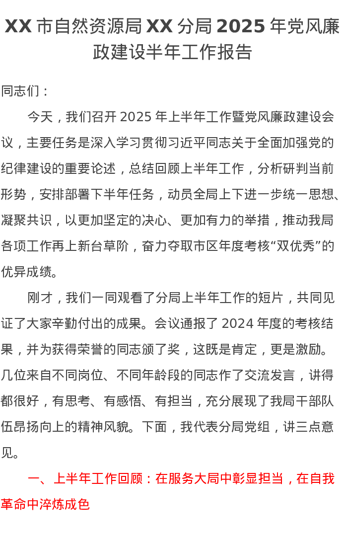 XX市自然资源局XX分局2025年党风廉政建设半年工作报告