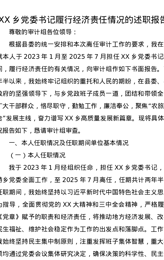 XX乡党委书记履行经济责任情况的述职报告