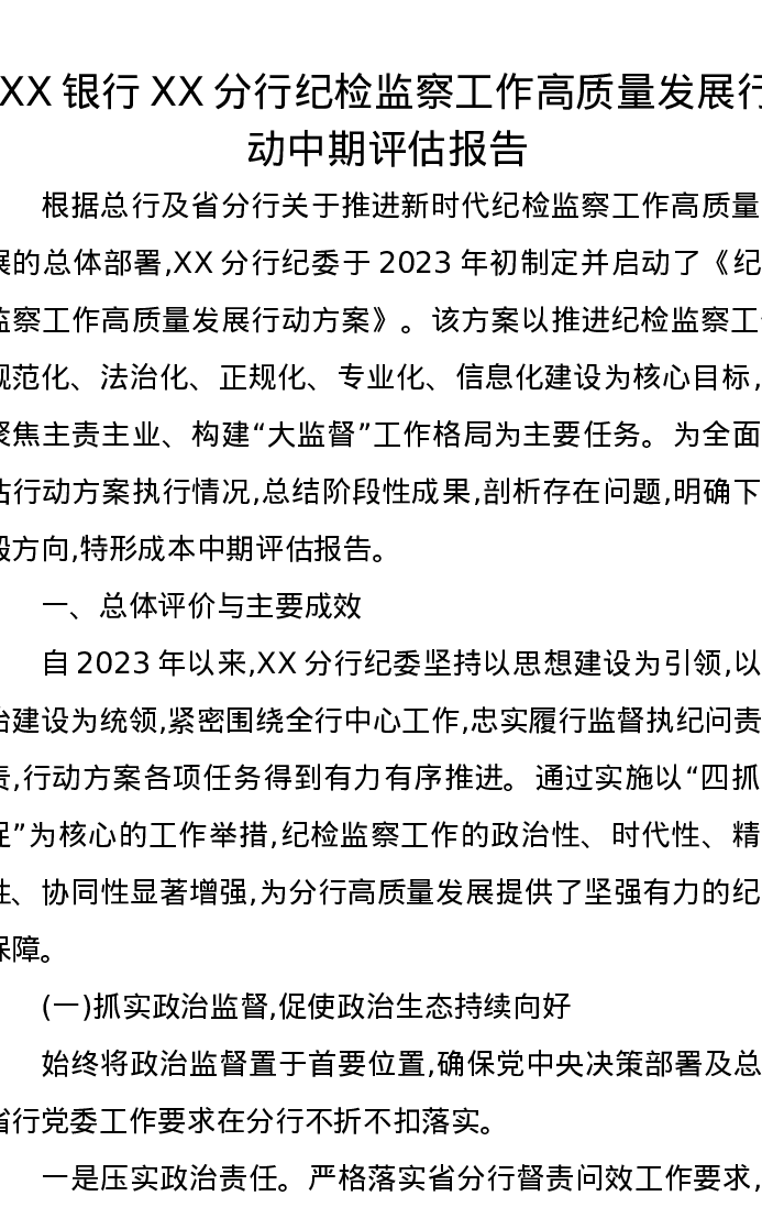 XX银行XX分行纪检监察工作高质量发展行动中期评估报告