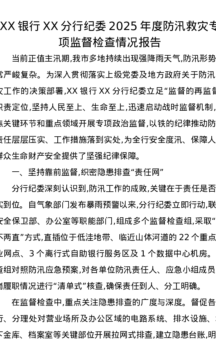 XX银行XX分行纪委2025年度防汛救灾专项监督检查情况报告