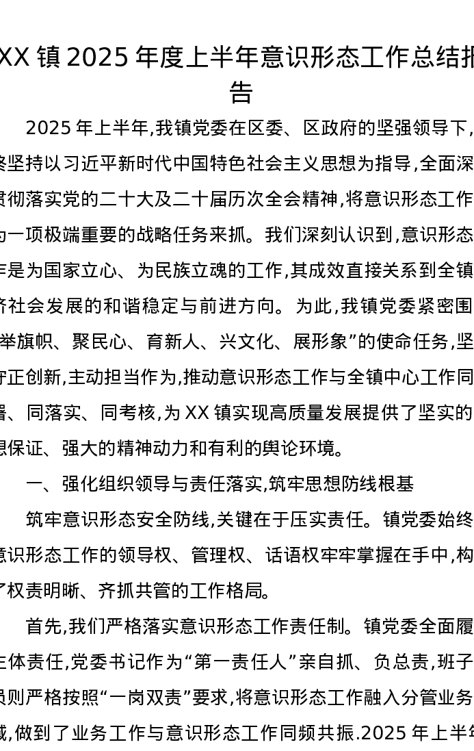 XX镇2025年度上半年意识形态工作总结报告