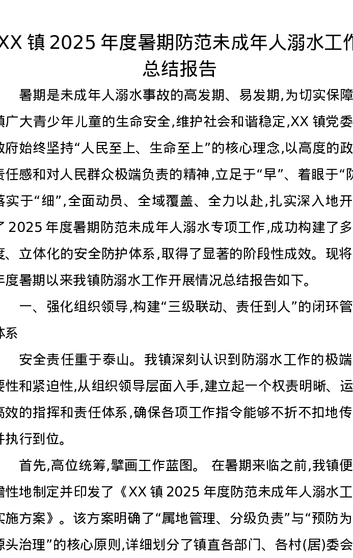 XX镇2025年度暑期防范未成年人溺水工作总结报告