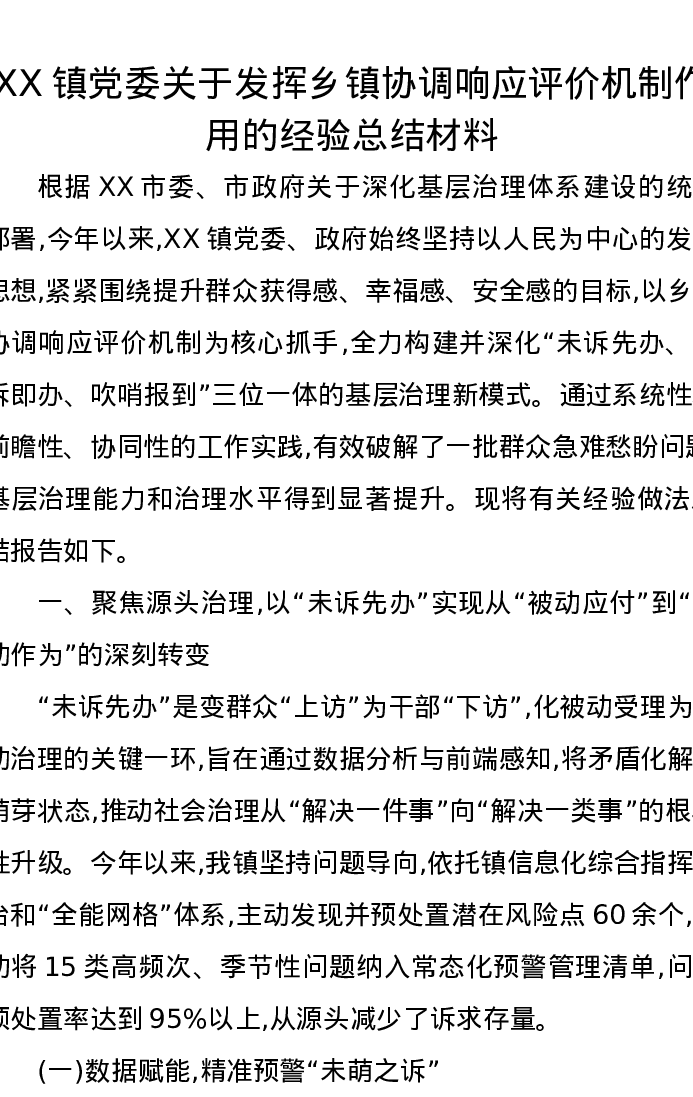 XX镇党委关于发挥乡镇协调响应评价机制作用的经验总结材料
