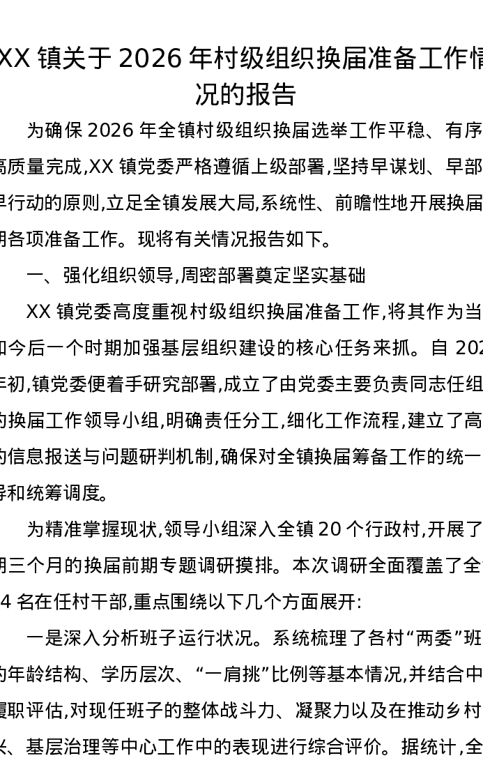 XX镇关于2026年村级组织换届准备工作情况的报告