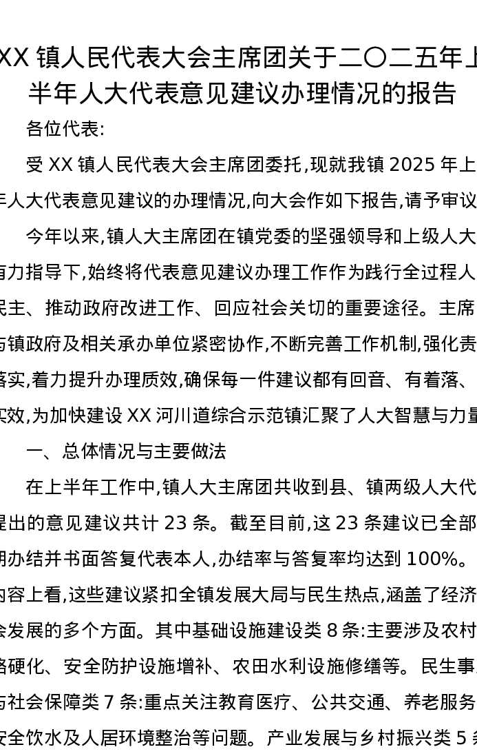 XX镇人民代表大会主席团关于二〇二五年上半年人大代表意见建议办理情况的报告