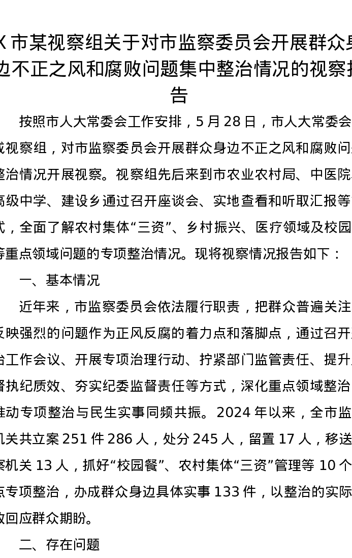 X市某视察组关于对市监察委员会开展群众身边不正之风和腐败问题集中整治情况的视察报告