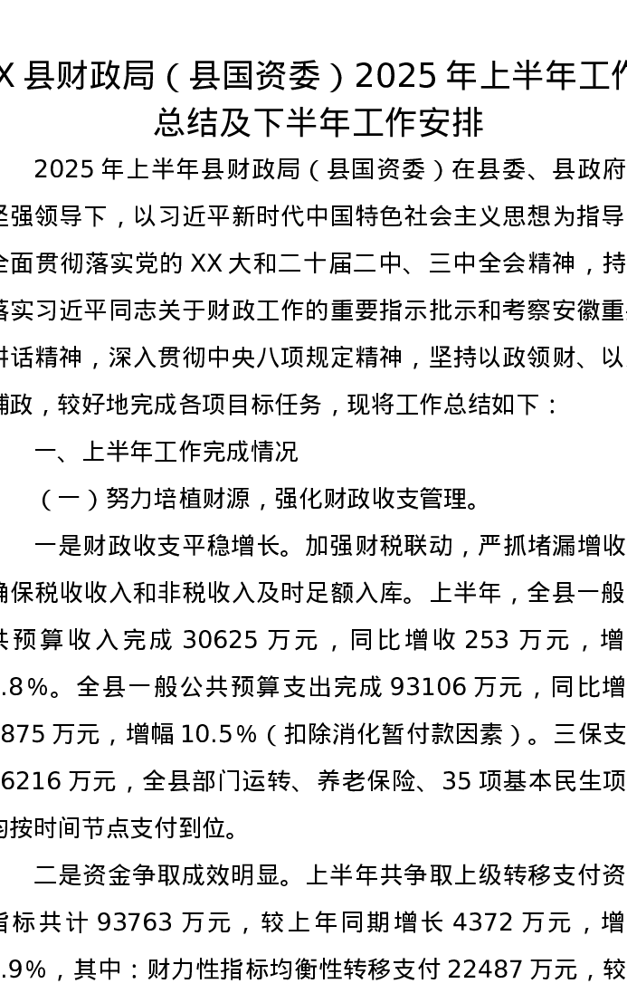 X县财政局(县国资委)2025年上半年工作总结及下半年工作安排