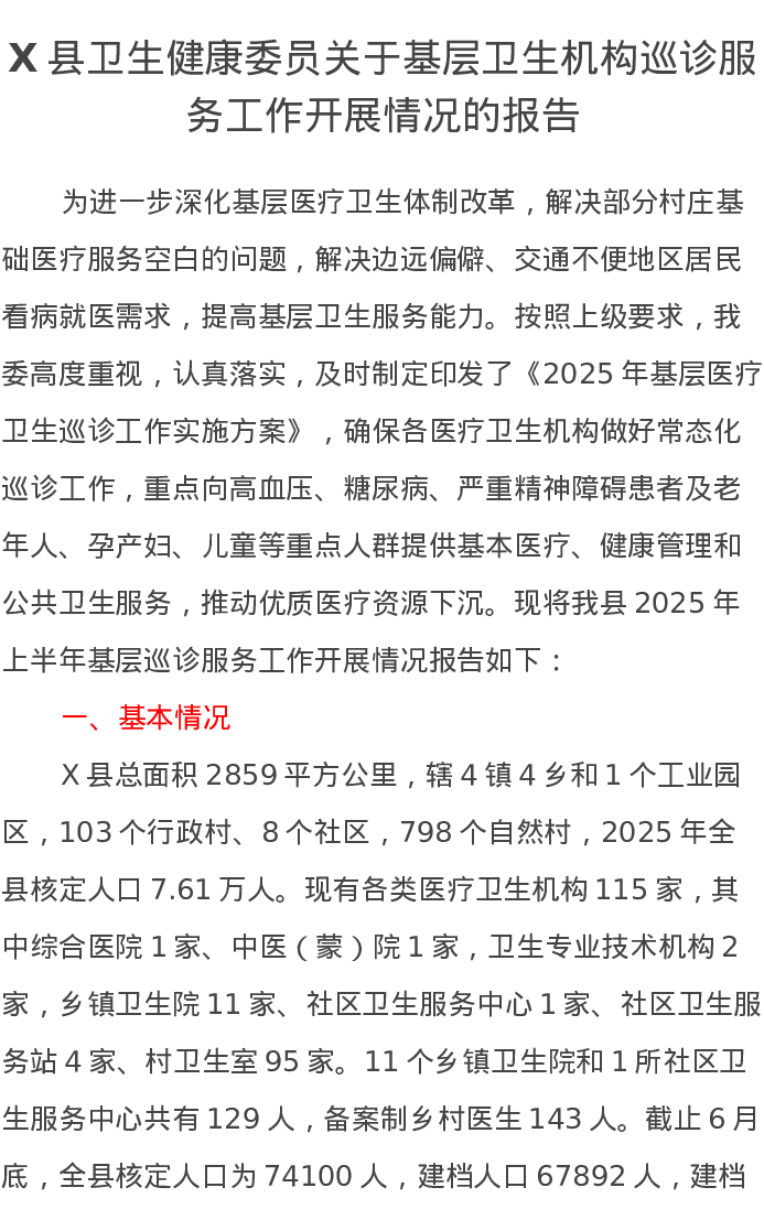 X县卫生健康委员关于基层卫生机构巡诊服务工作开展情况的报告