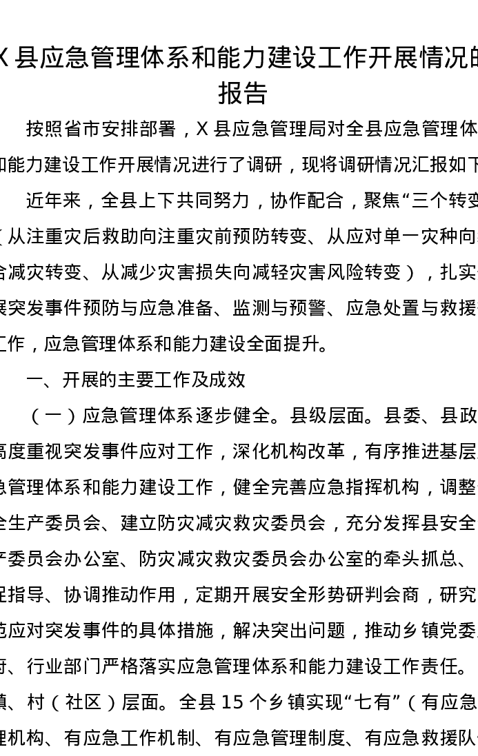 X县应急管理体系和能力建设工作开展情况的报告
