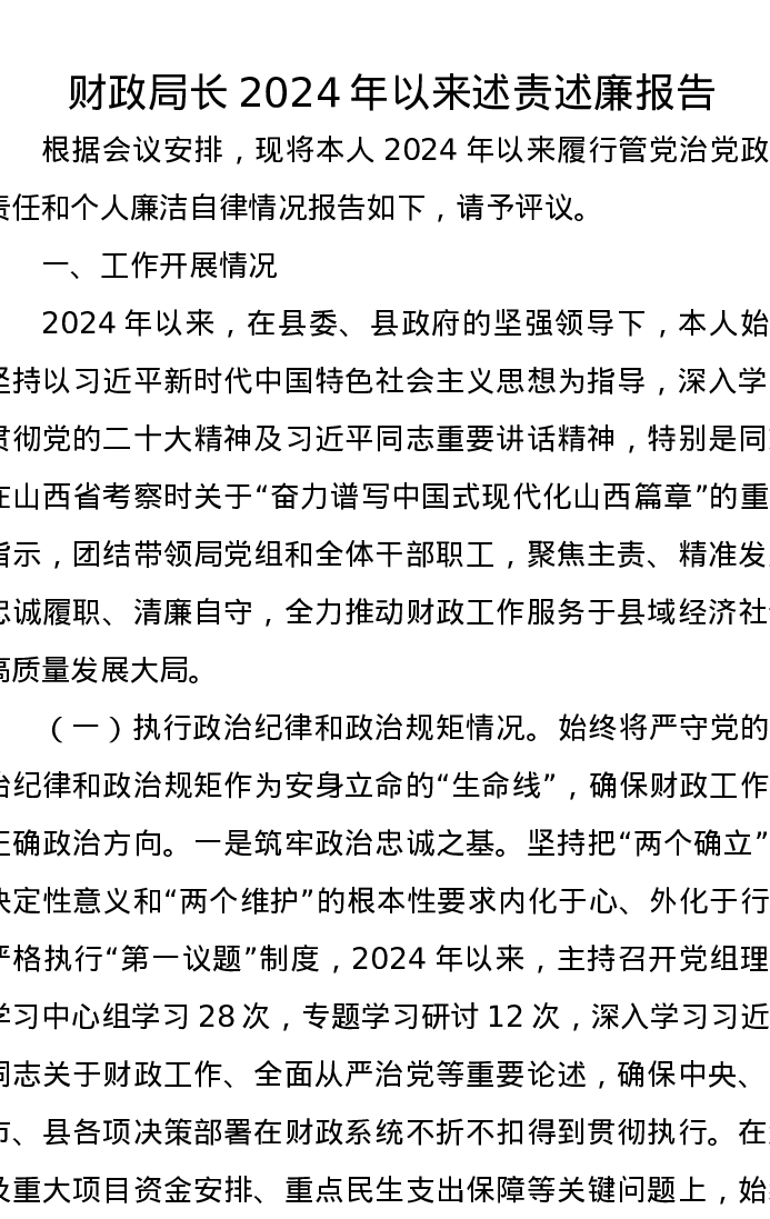 财政局长2024年以来述责述廉报告