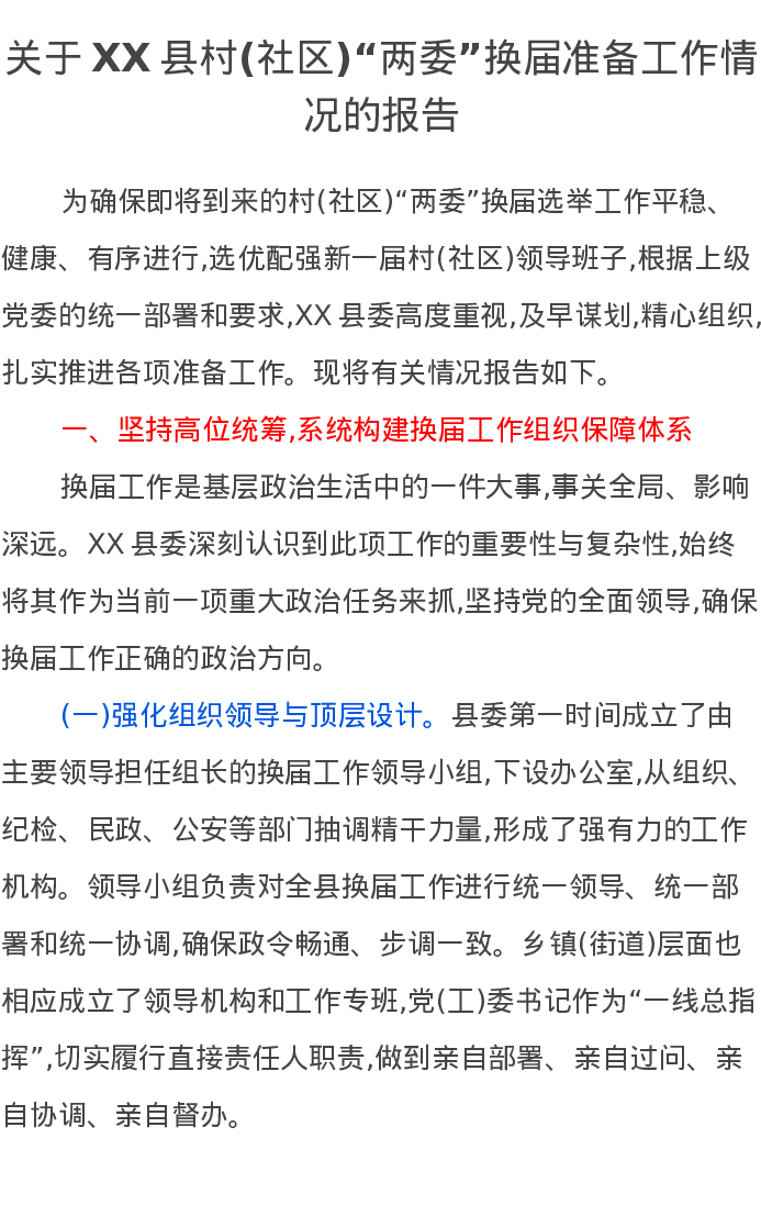 关于XX县村(社区)“两委”换届准备工作情况的报告