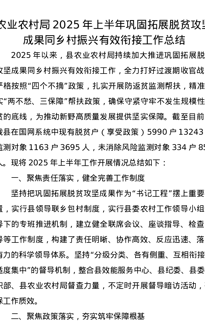 农业农村局2025年上半年巩固拓展脱贫攻坚成果同乡村振兴有效衔接工作总结