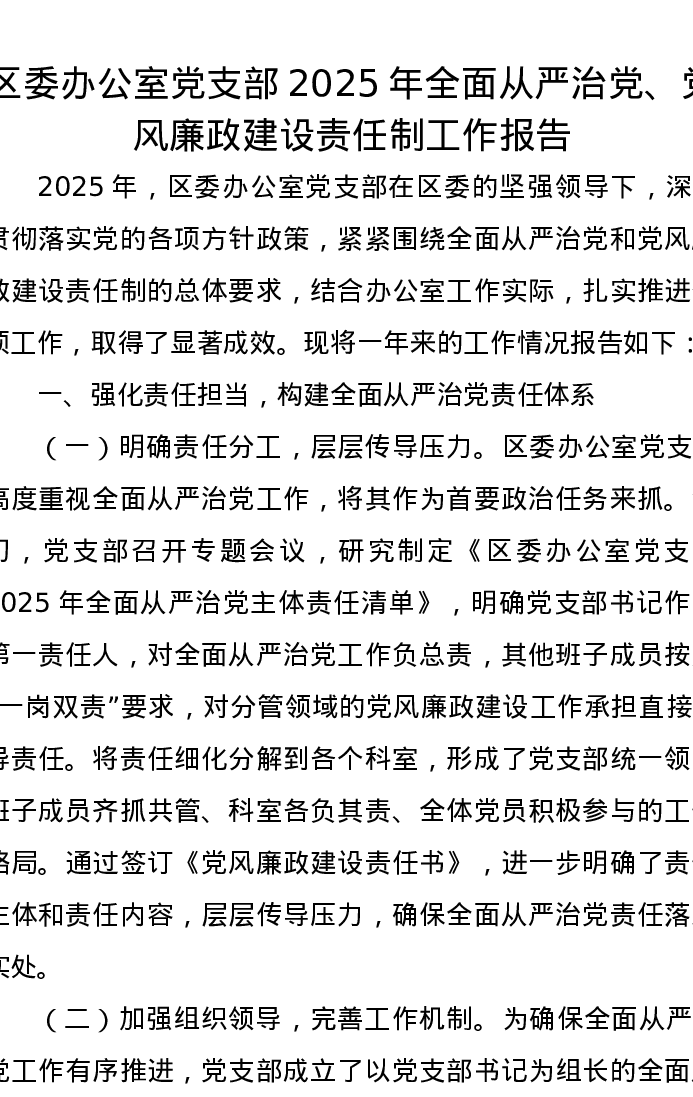 区委办公室党支部2025年全面从严治党、党风廉政建设责任制工作报告