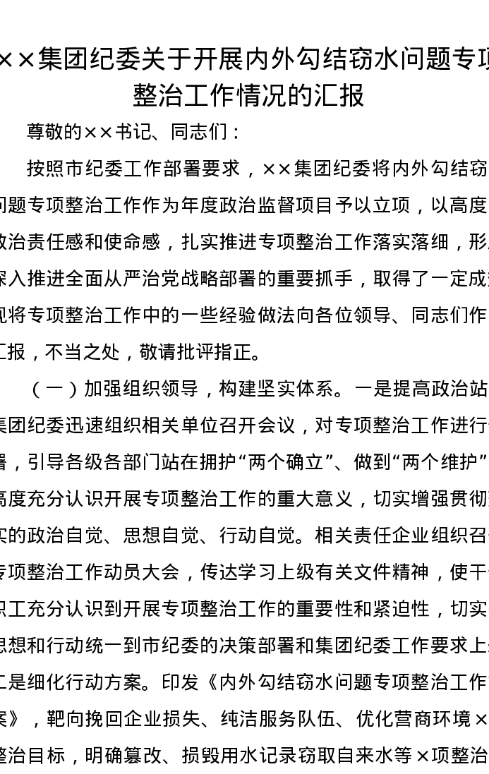××集团纪委关于开展内外勾结窃水问题专项整治工作情况的汇报