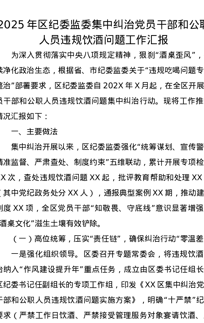 2025年区纪委监委集中纠治党员干部和公职人员违规饮酒问题工作汇报