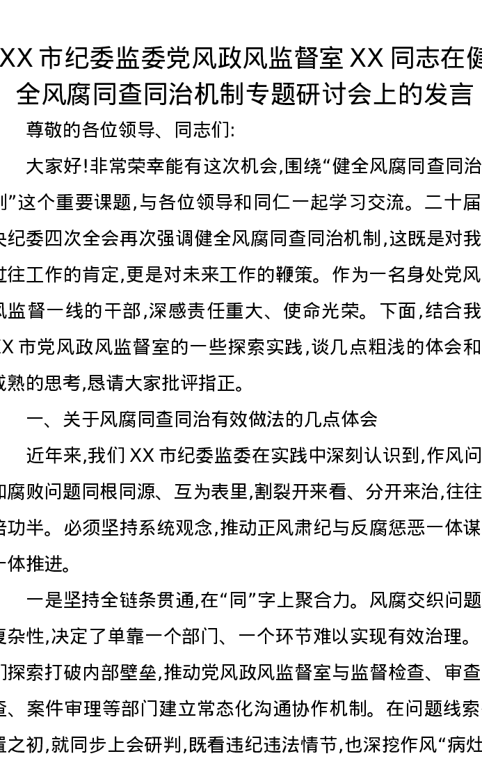 XX市纪委监委党风政风监督室XX同志在健全风腐同查同治机制专题研讨会上的发言