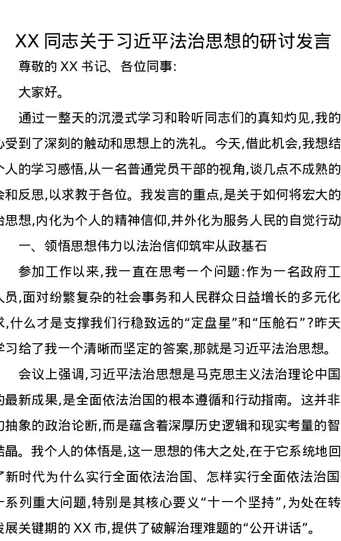 XX同志关于习近平法治思想的研讨发言