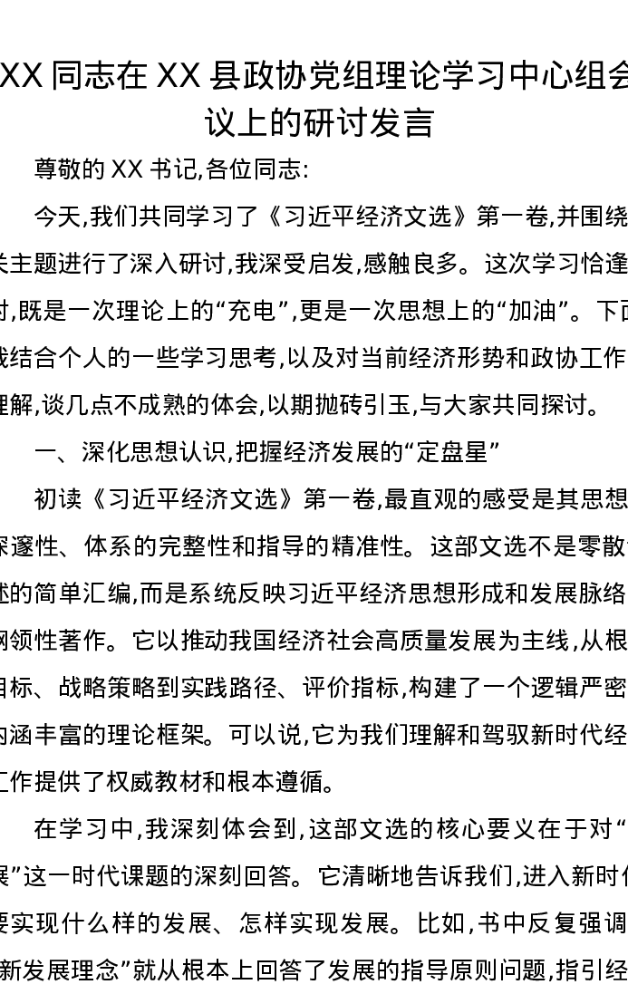XX同志在XX县政协党组理论学习中心组会议上的研讨发言