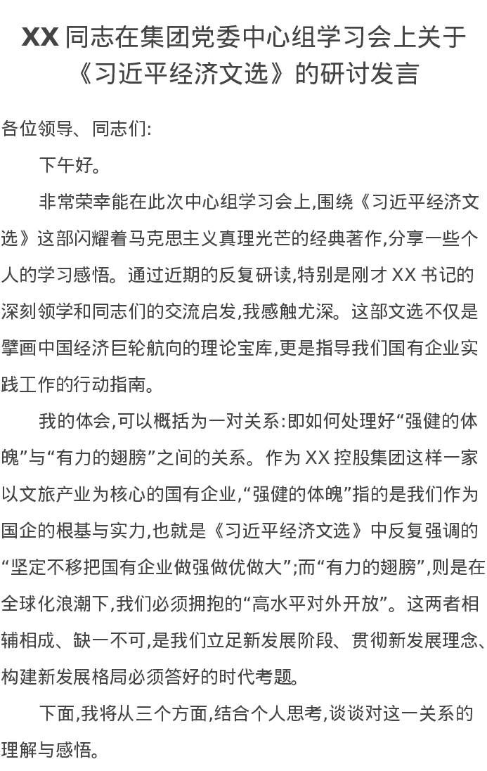 XX同志在集团党委中心组学习会上关于《习近平经济文选》的研讨发言