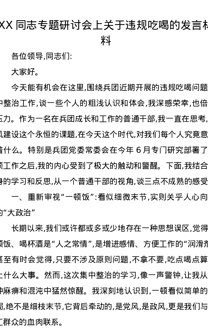 XX同志专题研讨会上关于违规吃喝的发言材料