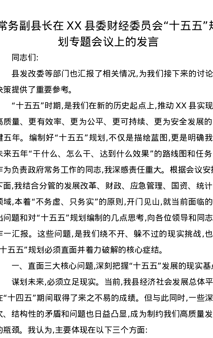 常务副县长在XX县委财经委员会“十五五”规划专题会议上的发言