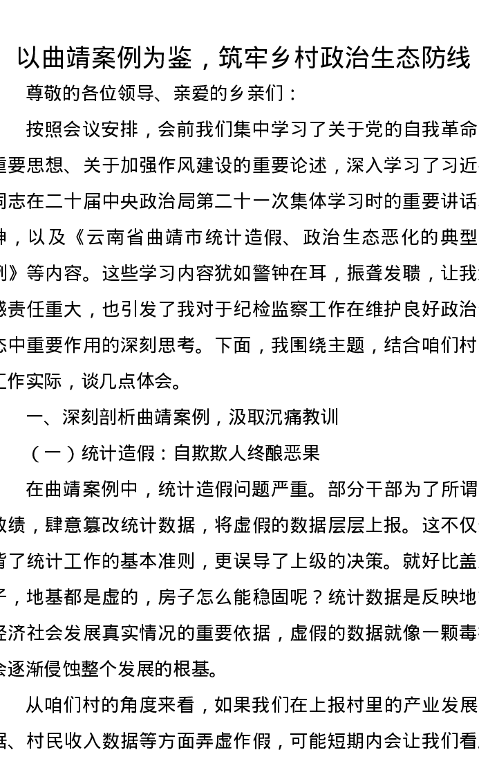 村干部2025年云南省曲靖市统计造假、政治生态恶化典型案例交流研讨发言