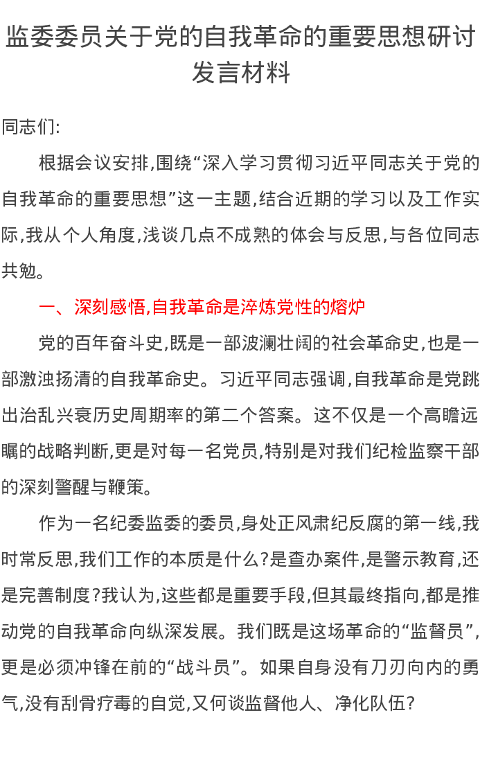 监委委员关于党的自我革命的重要思想研讨发言材料