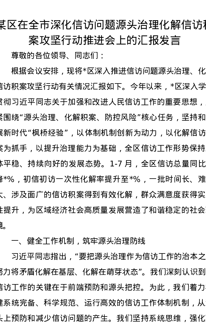 某区在全市深化信访问题源头治理化解信访积案攻坚行动推进会上的汇报发言