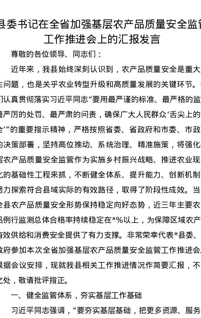 县委书记在全省加强基层农产品质量安全监管工作推进会上的汇报发言