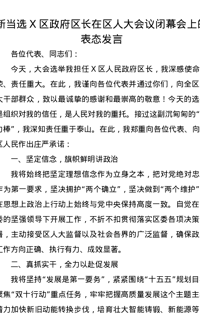 新当选X区政府区长在区人大会议闭幕会上的表态发言