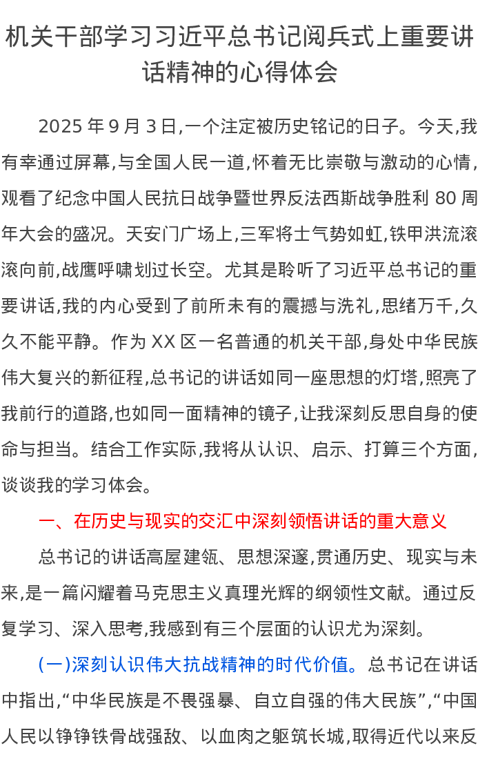 机关干部学习习近平总书记阅兵式上重要讲话精神的心得体会
