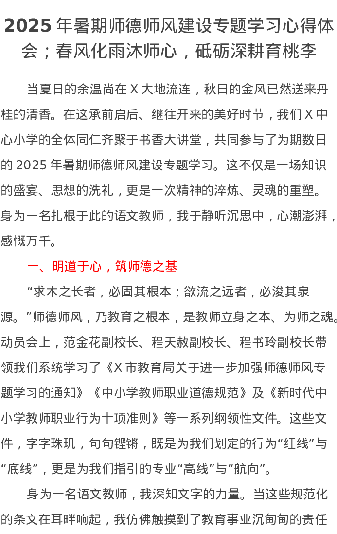 2025年暑期师德师风建设专题学习心得体会;春风化雨沐师心,砥砺深耕育桃李