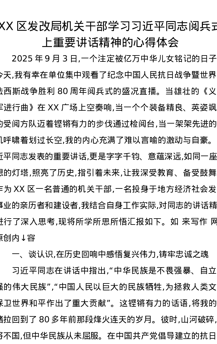 XX区发改局机关干部学习习近平总书记阅兵式上重要讲话精神的心得体会
